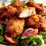 - Add Chicken to Salad: Slice the air-fried chicken tenders into strips and arrange them on top of the mixed salad.