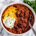 When your chili is ready to eat, dish it out into warm bowls and dress it up with a sprinkle of green onions or cilantro, a handful of shredded cheddar cheese, and a dollop of sour cream. These finishing touches add fresh, creamy, and savory contrasts that elevate every single bite.