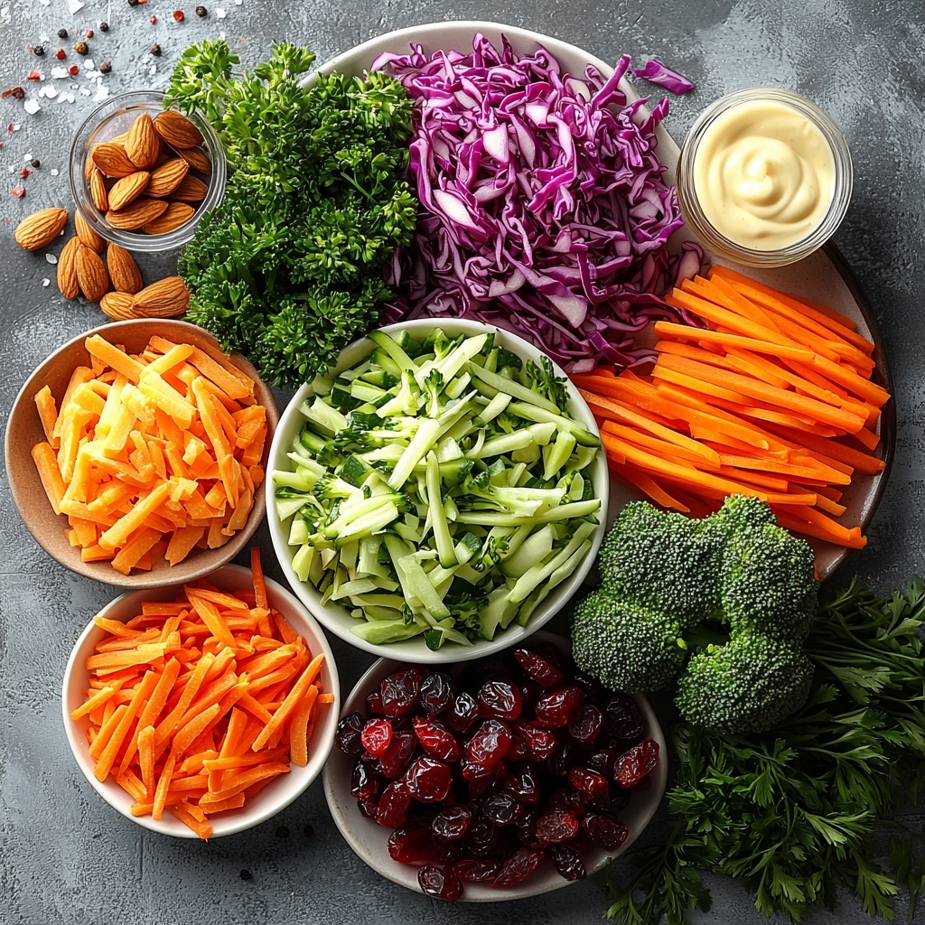 This Broccoli Slaw Recipe relies on simple, wholesome ingredients that create a perfect balance of colors, crunch, and flavor. Each component plays a crucial role, from the fresh vegetables to the warmly toasted nuts and the zingy dressing that ties it all together.