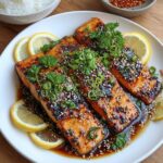 This Broiled Miso Salmon recipe features tender, flaky salmon fillets marinated in a savory blend of white miso paste, mirin, sake, soy sauce, sugar, sesame oil, and fresh ginger. Quickly broiled to achieve a caramelized, golden-brown top, the dish is garnished with toasted sesame seeds and green onions for extra flavor and texture. Perfect for a quick, flavorful weeknight dinner, this Japanese-inspired recipe balances umami and sweetness with a fresh citrus finish from optional lemon wedges.