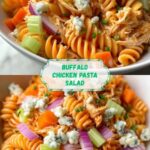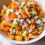 A spicy and creamy Buffalo Chicken Pasta Salad that combines tender shredded chicken tossed in hot buffalo sauce with crisp vegetables and rotini pasta, all coated in tangy blue cheese dressing. Perfect for a flavorful, chilled dish that’s easy to prepare and great for potlucks or a quick meal.