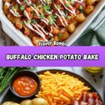 This Buffalo Chicken Roasted Potato Bake is a flavorful, hearty dish combining crispy roasted potatoes, spicy buffalo chicken, melted cheeses, and savory turkey bacon. Perfect for a crowd-pleasing dinner, it offers a delightful balance of textures and a spicy kick, topped with green onions and served with ranch or sour cream for extra creaminess.