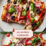 Think beyond just slicing regularly—try cutting the flatbread pizza into fun shapes like tombstones or jack-o’-lantern wedges using cookie cutters for a themed party. Serving on a dark slate or wooden board adds to the spooky aesthetic and makes the colors really pop.