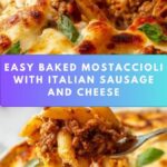 Mostaccioli is a delicious baked Italian pasta dish featuring tender pasta tossed with savory Italian sausage and marinara sauce, layered with a rich mixture of ricotta, parmesan, and mozzarella cheeses, then baked until bubbly and golden brown. This hearty and comforting recipe is perfect for family dinners and serves 8.
