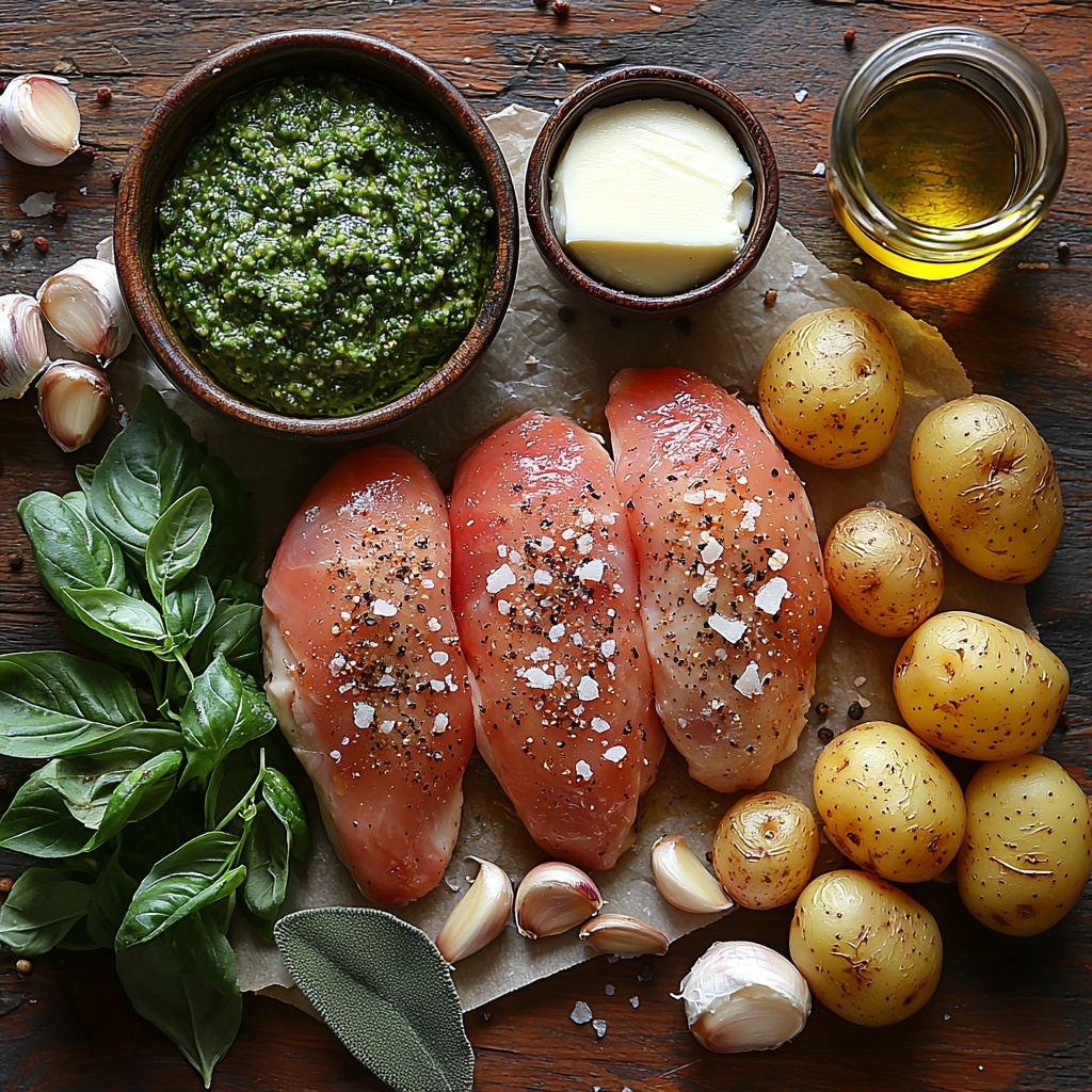 Serve this dish family-style on a large wooden board with the chicken sliced and potatoes arranged around for a rustic Mediterranean vibe. Or plate it elegantly with a drizzle of pesto cream artistically swirled and a mushroom stack on top of the chicken for a restaurant-worthy appearance. Either way, it’s a crowd-pleaser that’s as fun to share as it is to eat.