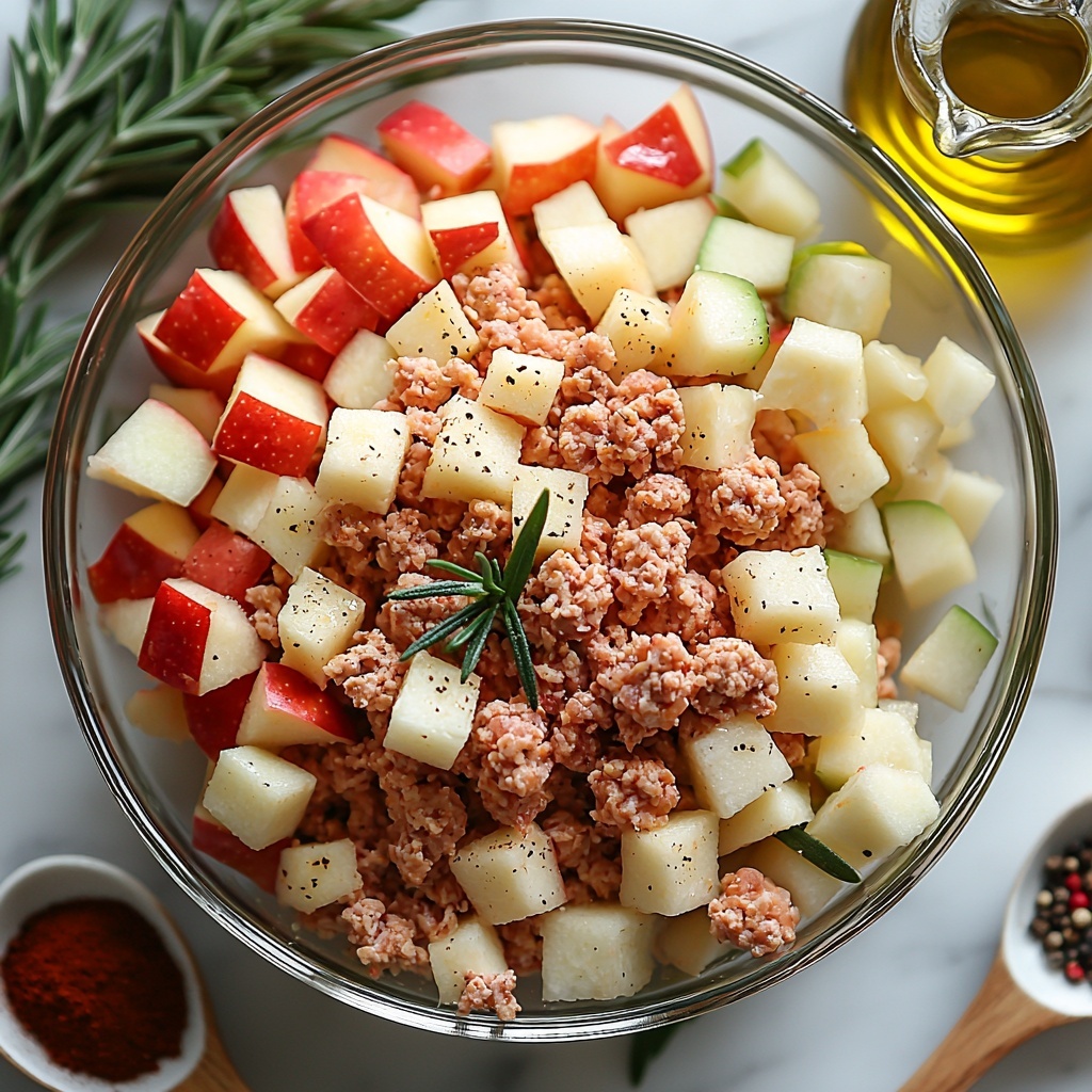 In a large bowl, combine the ground chicken, diced apples, garlic powder, ground sage, fennel seeds, rosemary, cinnamon, salt, and black pepper. Use your hands or a stiff spatula to mix everything thoroughly until the ingredients are well incorporated and evenly distributed. This ensures each bite is packed with balanced flavor and texture.