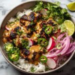 Chicken Satay Rice Bowls feature tender, marinated chicken thighs cooked to perfection and served over fluffy jasmine rice. This Asian-inspired dish is complemented by a creamy peanut sauce, fresh vegetables, and crunchy peanuts, making it a balanced and flavorful meal perfect for a healthy dinner.