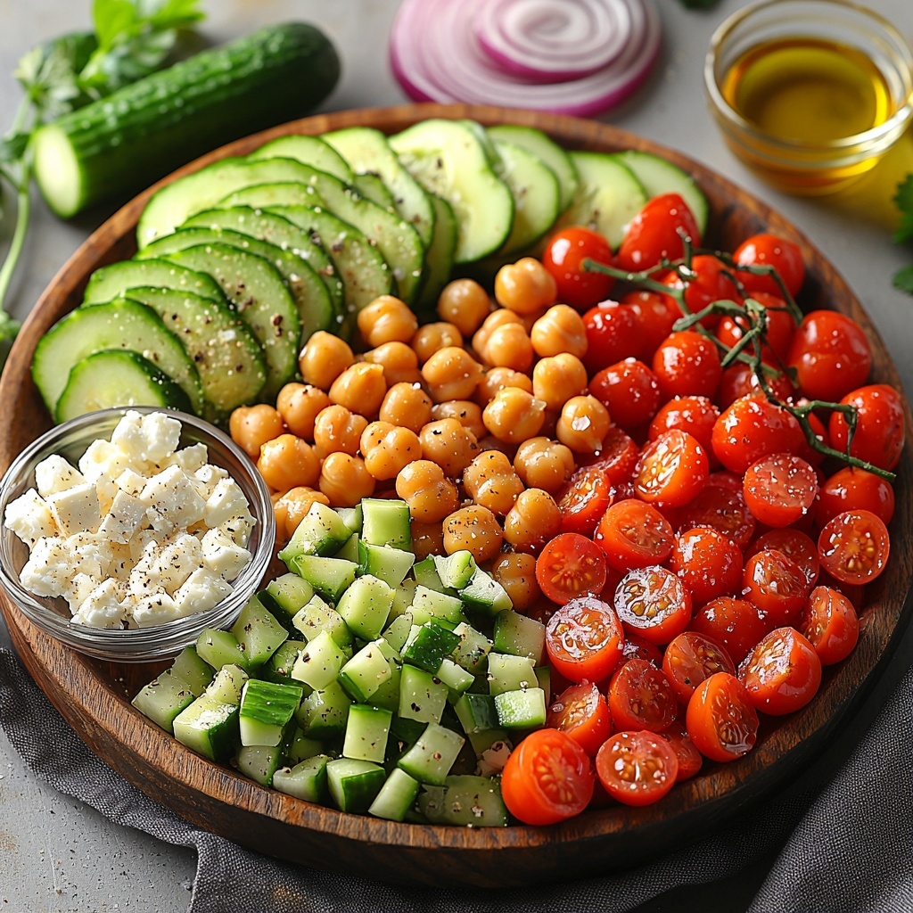 2. Combine Salad Components: In a large mixing bowl, add the drained chickpeas, halved cherry tomatoes, diced cucumber, thinly sliced red onion, and crumbled feta cheese, evenly distributing each ingredient.
