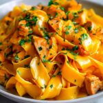 Plate the warm creamy pasta and chicken, then sprinkle fresh chopped parsley over the top. The parsley not only adds a vibrant green pop but also gives a fresh contrast to the buttery richness, making each bite even more enjoyable.