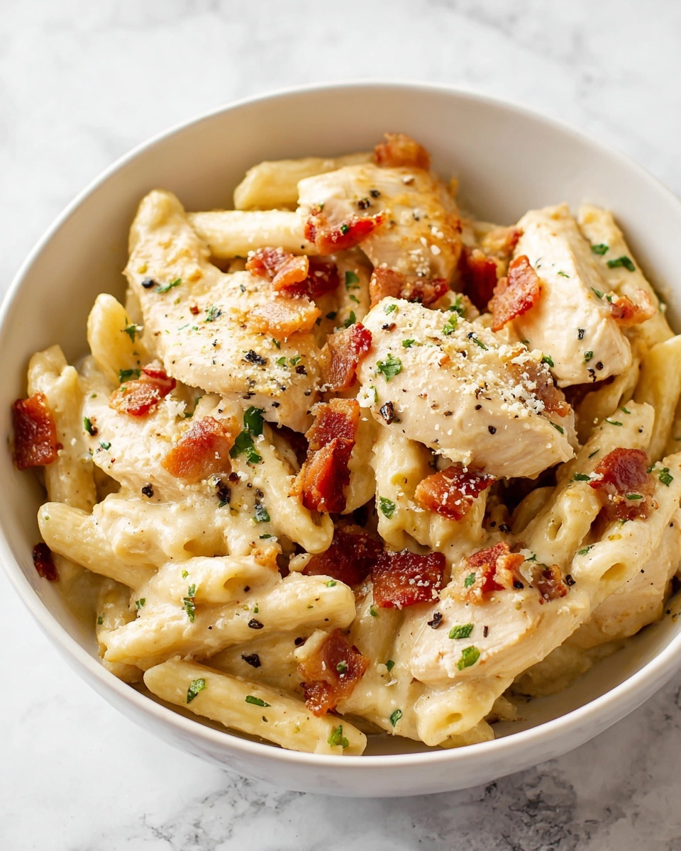 Creamy Chicken Penne Pasta with Bacon and Tomatoes Recipe