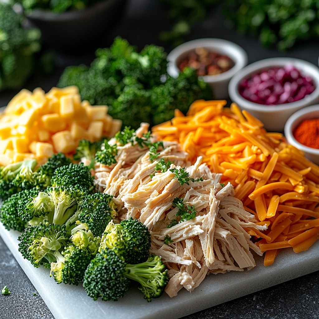 - Combine chicken and broccoli: In a large mixing bowl, combine shredded cooked chicken and prepared broccoli florets evenly.