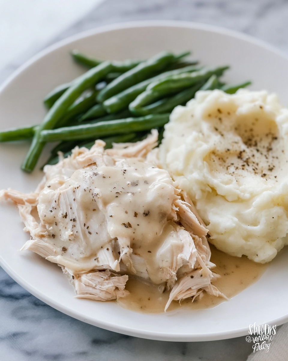 This Crockpot Chicken and Gravy Recipe pairs beautifully with simple green vegetables like steamed broccoli, roasted asparagus, or a crisp garden salad. The freshness of the veggies balances the rich, creamy gravy and makes the meal feel complete.