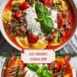 This Crockpot Lasagna Soup is a comforting and hearty recipe that combines all the flavors of classic lasagna in a warm, easy-to-make soup. Ground beef, onions, garlic, tomatoes, and lasagna noodles slow cook together with Italian herbs to create a rich broth, topped with creamy ricotta, Parmesan, and melted mozzarella cheese, garnished with fresh basil for a fresh finish.