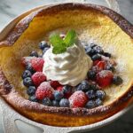 This Dutch Baby recipe is a delightful oven-baked pancake that puffs up beautifully in a hot cast-iron skillet, delivering a light and airy texture with golden, crispy edges. Topped with a dusting of powdered sugar and a luscious maple whipped cream, it makes for an impressive yet simple breakfast or brunch treat that’s sure to please any crowd.