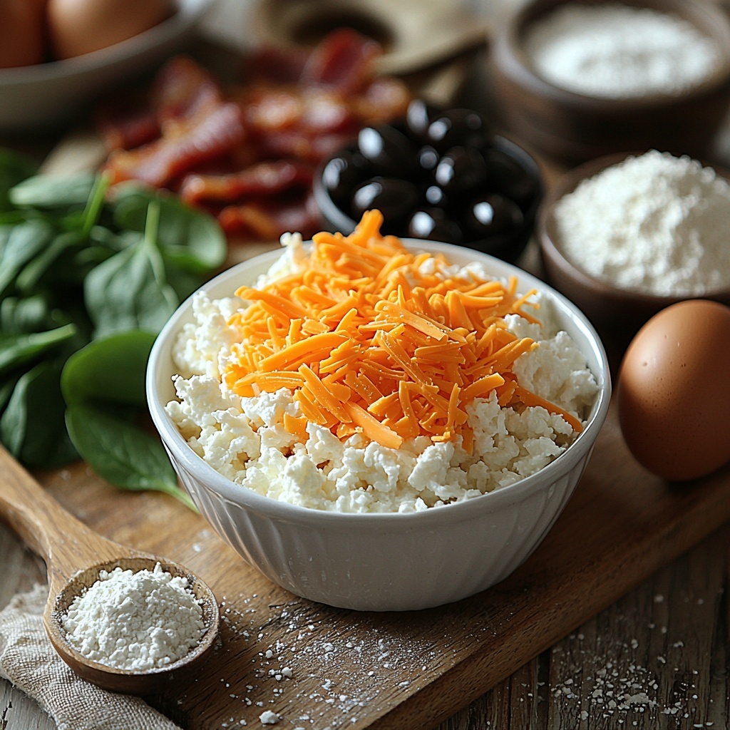Fold in the shredded cheddar, chopped bacon, fresh spinach, and sliced black olives thoroughly so each biscuit gets an even distribution of flavors and textures. This step guarantees every bite bursts with savory goodness.
