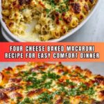 This Four Cheese Baked Macaroni is a rich, creamy, and comforting pasta casserole featuring a perfect blend of sharp cheddar, mozzarella, Gruyère, and Parmesan cheeses baked to golden perfection. Creamy and cheesy with a crispy breadcrumb topping, it’s an ideal main course for cheese lovers and a classic American comfort food that can be prepared ahead and baked just before serving.