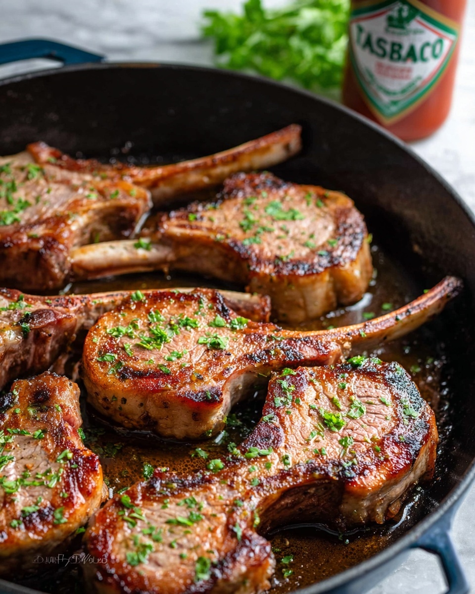 Tender lamb rib chops are coated in a flavorful garlic and herb crust, then seared to perfection for a juicy and fragrant main dish. Enhanced with a zesty touch of Tabasco and finished with a rich butter and stock sauce, this recipe offers a simple yet elegant way to enjoy lamb chops with vibrant herbaceous notes.