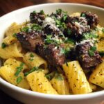 This Garlic Butter Steak Tips with Cheesy Rigatoni recipe features tender sirloin steak pieces seared in olive oil and butter combined with a rich, creamy garlic cheese sauce tossed with perfectly cooked rigatoni pasta. It’s a comforting and indulgent main course perfect for a hearty dinner.