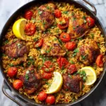 This Greek Chicken and Lemon Rice recipe features tender, juicy bone-in chicken thighs baked together with aromatic lemon-infused rice. The dish combines Mediterranean flavors with simple cooking techniques, making it a delicious and wholesome one-pot meal perfect for weeknight dinners or entertaining guests.
