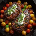 Fresh parsley is a fantastic simple garnish that brings brightness and a touch of herbal freshness, but you can also experiment with a dollop of sour cream or a sprinkle of green onions to add layers of creamy and sharp flavors that complement the grilled meat and tender potatoes perfectly.