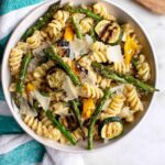 A vibrant and healthy Grilled Vegetable Pasta Salad featuring perfectly cooked fusilli pasta combined with smoky grilled asparagus, zucchini, corn, and yellow bell pepper. Tossed with a zesty lemon-garlic dressing, fresh basil, and Parmesan cheese, this salad is ideal as a refreshing side dish or light main course, perfect for warm weather gatherings or meal prep.