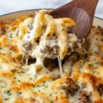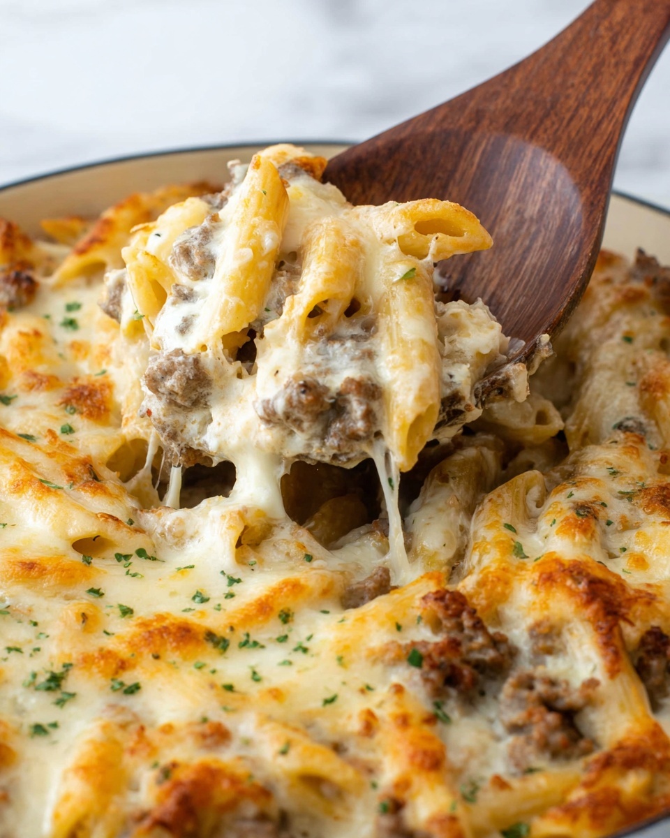 This hearty Ground Beef Alfredo Bake combines tender penne pasta with savory browned ground beef and a creamy Alfredo sauce, all topped with melted mozzarella and parmesan cheese. It’s a comforting, oven-baked dish perfect for a satisfying weeknight dinner.