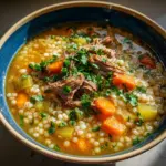 Hearty Beef and Barley Soup is a comforting and nutritious dish featuring tender beef stew meat, pearl barley, and a medley of vegetables simmered together in a flavorful beef broth with herbs. Perfect for a warming meal, this soup combines the richness of beef with wholesome barley and aromatic seasonings to create a satisfying bowl that’s great for any time of year.