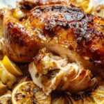 This Honey Lemon Roast Chicken recipe delivers a perfectly roasted whole chicken glazed with a flavorful mix of honey, fresh lemon juice, garlic, and herbs. The lemon quarters stuffed inside the cavity infuse the meat with citrus aroma while the herb glaze keeps the skin crispy and deliciously golden. Ideal for a comforting family dinner, this dish pairs wonderfully with roasted vegetables or a fresh salad.