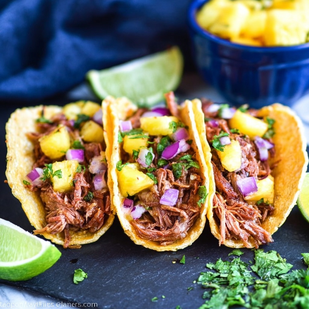 Topping your tacos with diced fresh pineapple adds juicy bursts of sweetness that complement the smoky pork beautifully. Red onions offer a crisp bite, while fresh cilantro lends an herbal brightness that lifts the whole dish. Creamy avocado slices or a drizzle of tangy crema can add cooling richness, rounding out the experience.
