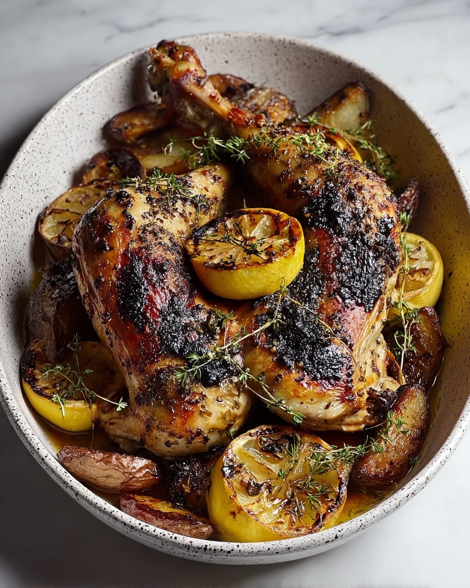 Serve the chicken whole on a large platter surrounded by roasted lemon halves and a scattering of fresh herbs for a rustic, elegant look. For a casual vibe, carve the chicken and serve it family-style with bowls of sides on the table for everyone to dig in. Either way, it makes for a beautiful, inviting presentation.