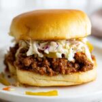 - Assemble and Serve: Spoon the sloppy joe mixture onto the toasted buns. Add optional toppings such as mayo, sweet pickles, and coleslaw to taste, then serve immediately while warm.