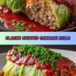 This classic Old-Fashioned Stuffed Cabbage Rolls recipe features tender cabbage leaves filled with a savory mixture of ground beef, pork, rice, and spices, baked in a rich tomato sauce. A hearty and comforting Eastern European dish that’s perfect for family dinners or holiday meals.