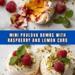 - Assemble the Pavlova Bombs: Gently cut a small hole or hollow out the center of each meringue bomb. Fill each with a spoonful of lemon curd, then add a dollop of whipped cream. Drizzle raspberry coulis over the cream and garnish with chopped pistachios, fresh raspberries, and mint sprigs. Dust lightly with icing sugar before serving.