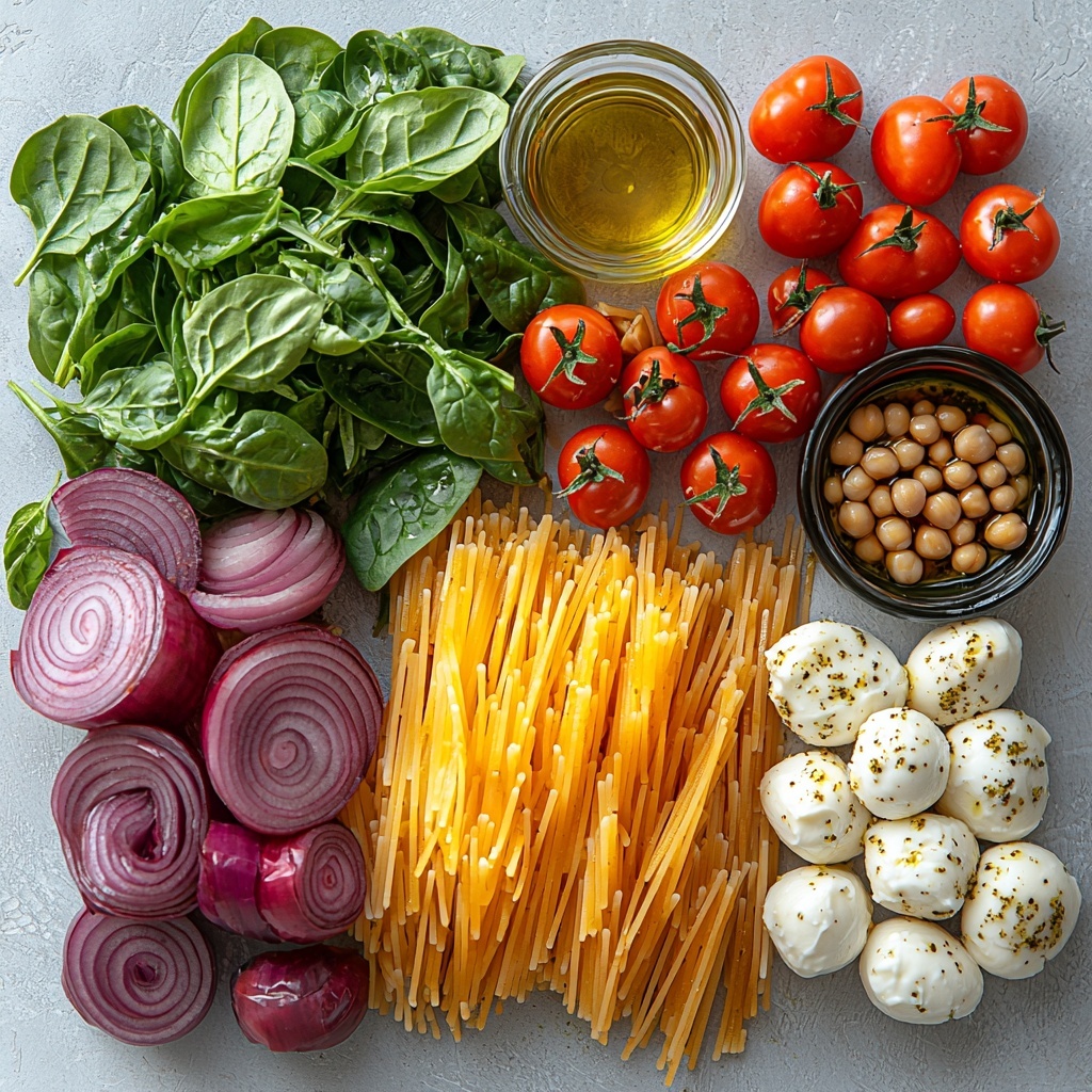 2. Combine Salad Ingredients: In a large bowl, combine the cooked pasta, halved cherry tomatoes, chopped fresh spinach, diced red onion, fresh mozzarella balls, sliced olives, and rinsed chickpeas or white beans. Toss gently to mix the ingredients evenly.
