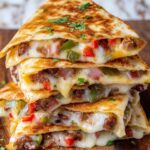 This Philly Cheesesteak Quesadilla combines the classic flavors of a Philly cheesesteak sandwich with the crispy, melty appeal of a quesadilla. Tender, thinly sliced beef is sautéed with colorful bell peppers, mushrooms, and onions, then layered with provolone cheese inside a warm flour tortilla. The quesadilla is pan-seared until golden and crisp, offering a savory and satisfying meal that’s perfect for lunch or dinner.