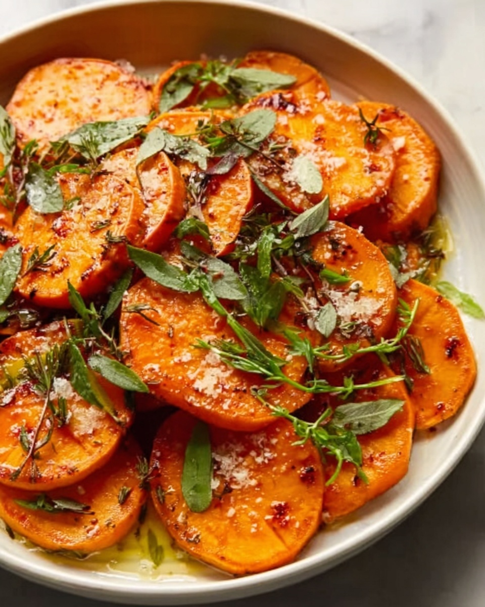 - Add finishing touches: Sprinkle fresh thyme leaves over the arranged sweet potatoes and, if desired, add extra grated Parmesan on top for added flavor and a delicious crust.