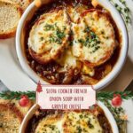 This Slow Cooker French Onion Soup is a comforting and flavorful classic made easy with caramelized onions, rich beef and chicken broth, and aromatic herbs. Finished with toasted baguette slices topped with melted Gruyère cheese, this hearty soup is perfect for a cozy meal that requires minimal hands-on time.