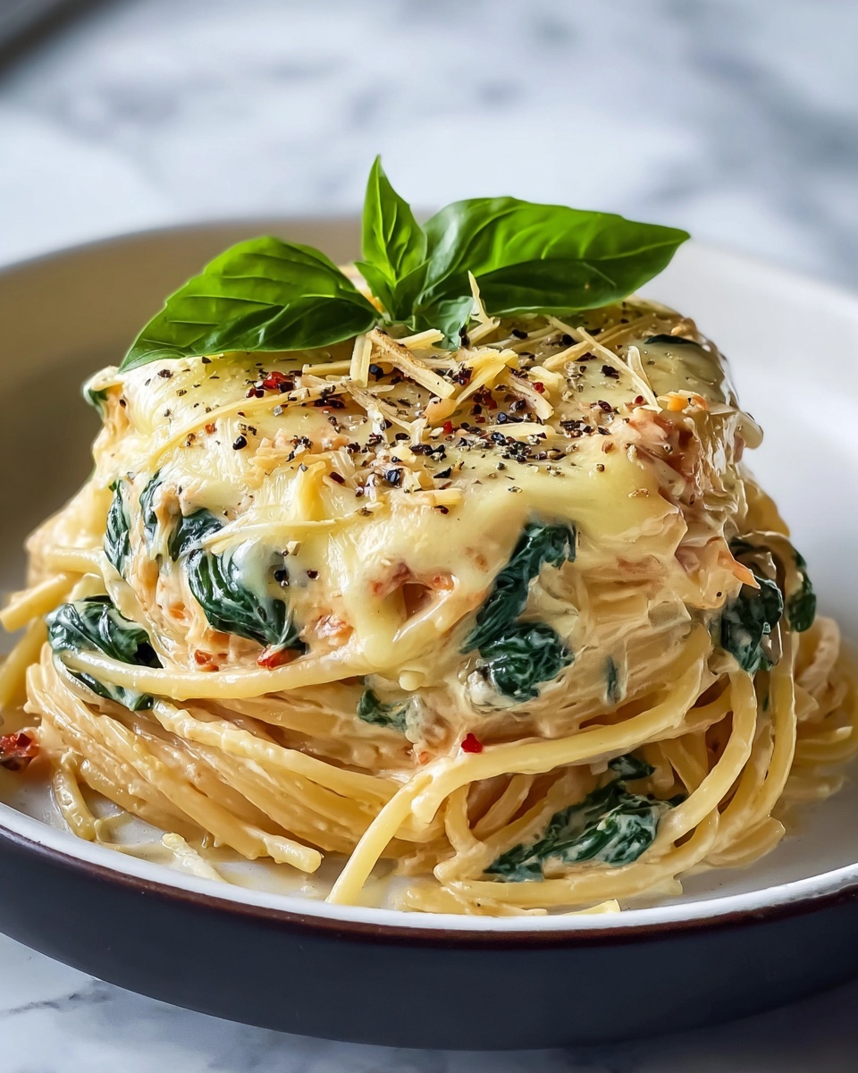 Reheat leftovers gently in a skillet over low heat, adding a splash of milk or cream if the sauce feels too thick. This helps restore the sauce’s silky consistency without overcooking the spinach or pasta. Avoid microwave reheating when possible for best texture.
