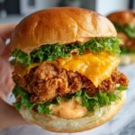 Lightly toast your burger buns to add a subtle crunch and prevent sogginess from the juicy chicken and sauce. Spread a generous layer of the spicy creamy sauce onto the bottom bun, add a piece of the crispy chicken, top with a slice of American cheese and fresh lettuce, then crown it with the top bun. Serve immediately to enjoy the perfect harmony of texture, heat, and flavor.