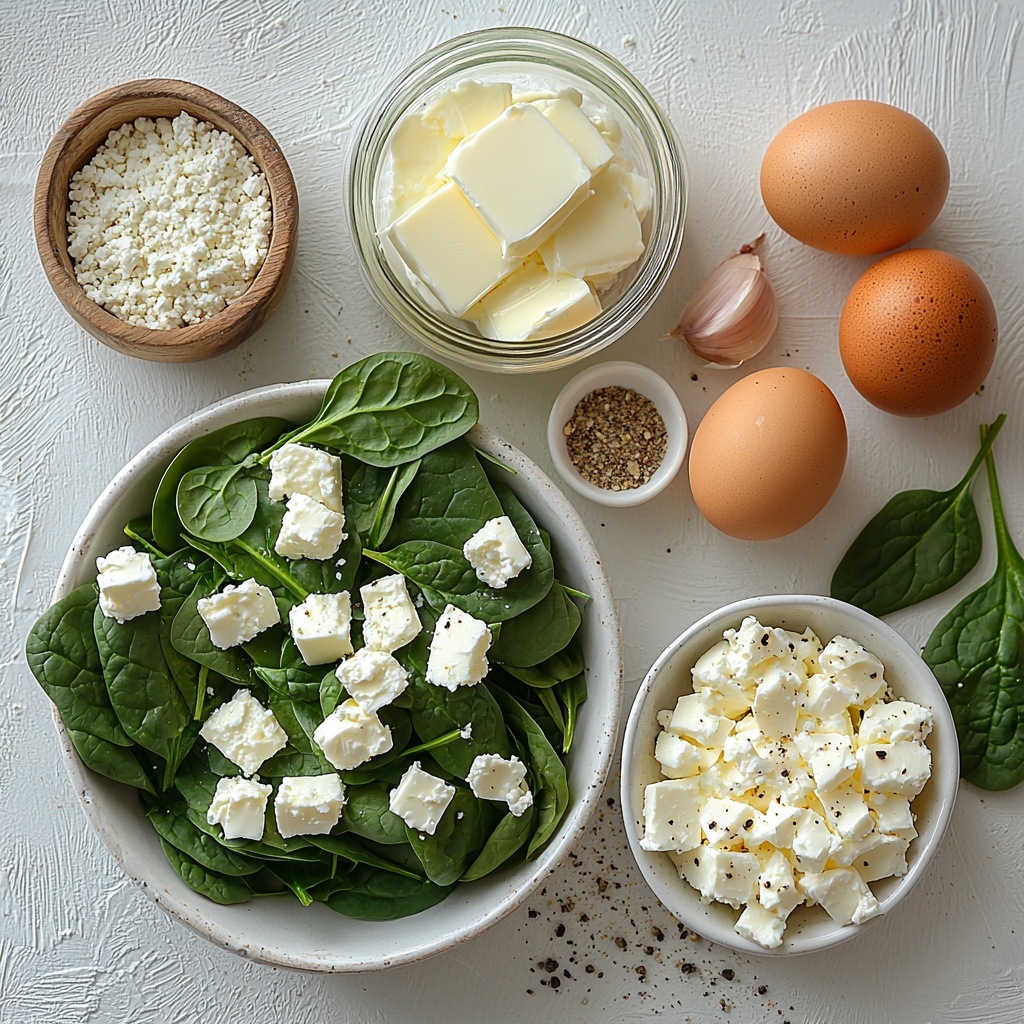 - Combine Ingredients: In a large mixing bowl, beat the eggs and mix with cottage cheese, thawed and drained spinach, crumbled feta, diced sweet onion, melted butter, grated Parmesan, black pepper, garlic powder, and a dash of nutmeg. Stir thoroughly until everything is well incorporated.