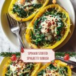 Once your spaghetti squash is perfectly roasted, use a fork to gently scrape the flesh inside, transforming it into those delightful “spaghetti” strands. Evenly divide the spinach mixture between the two halves, stuffing them generously with that rich filling.