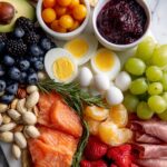 - Add Fruits and Accompaniments: Arrange fresh berries, sliced orange, strawberries, grapefruit slices, grapes, and watermelon pieces around the meats and cheeses. Add nuts, fresh herbs, avocado halves (if using), passion fruit halves (if using), hard boiled eggs, breadsticks, sliced baguette, crackers, and jellies to fill in gaps and add texture and variety to the board.