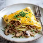 A hearty and comforting hobo casserole featuring ground beef, tender potatoes, and a creamy mushroom soup base topped with melted cheddar cheese. This easy-to-make dish is perfect for a family dinner, combining savory flavors and a cheesy finish baked to perfection.