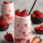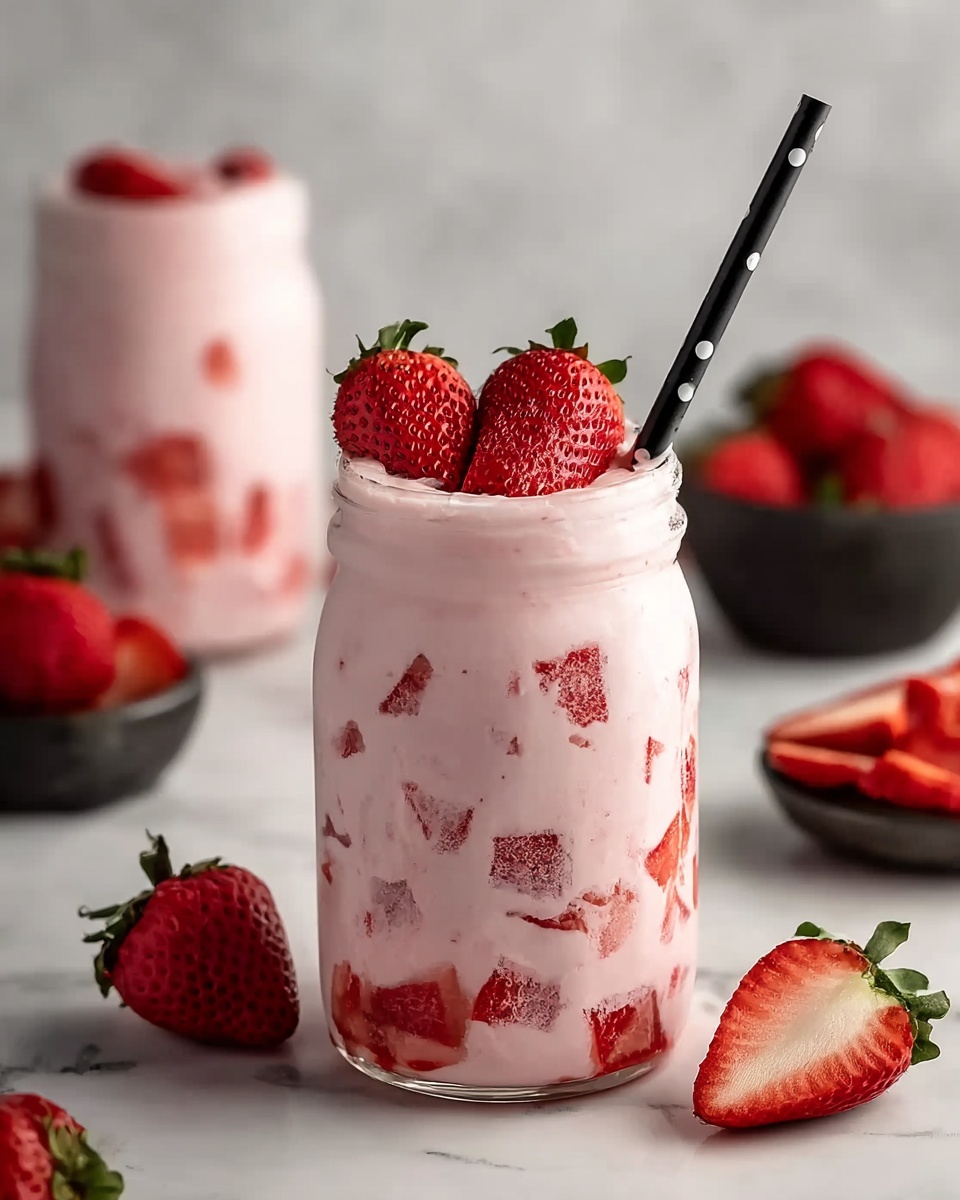 Finally, give the drink a gentle stir with a straw or spoon to blend the flavors just before sipping. For that extra special touch, garnish each glass with a fresh strawberry slice. Serve immediately to enjoy the perfect balance of chilled, creamy, and fruity goodness.