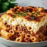 Start by preheating your oven to 350°F (175°C). Cook your pasta according to the package directions until it’s perfectly al dente — this ensures the pasta holds up through baking without becoming mushy. Drain it well, then set aside. Use the first tablespoon of olive oil to grease your baking dish so your pastitsio layers won’t stick and will slide out nicely when serving.